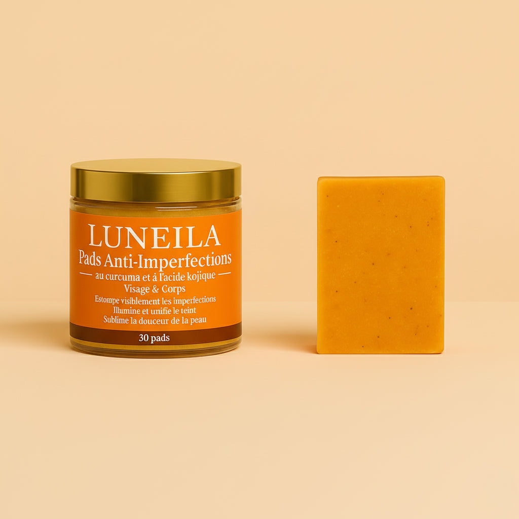 Le Savon au Curcuma nettoie la peau en profondeur tout en respectant son équilibre, et les Pads Anti-Imperfections exfolient en douceur et traitent les taches pour un teint plus uniforme.